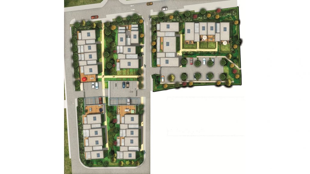La résidence est composée de 6 bâtiments de petit taille offrant de logements s’ouvrant en rez de jardin ou en terrasse.